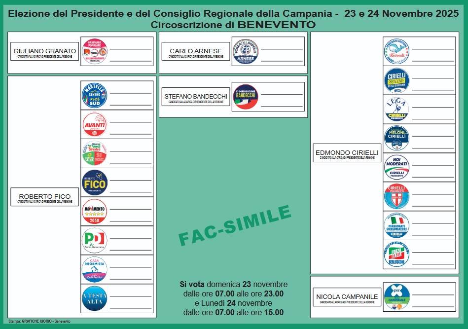 Se Noi di centro è stato “retrocesso” sul secondo gradino del podio, ciò è dovuto al precedente sorteggio, quello riguardante i candidati alla presidenza, che ha visto, appunto, primeggiare Giuliano Granato detto Giuliano, davanti a Roberto Fico, candidato governatore del centrosinistra, seguito da Carlo Arnese in pista per Forza del Popolo. Quindi, Stefano Bandecchi alla guida della lista Dimensione Bandecchi, dopodiché l’aspirante presidente della coalizione di centrodestra, il viceministro degli esteri Edmondo Cirielli. Chiude il sestetto di coloro che vorrebbero raccogliere l’eredità di Vincenzo De Luca il candidato di Per Nicola Campanile Presidente, appunto Nicola Campanile.