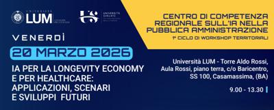 Bari, 19 mar. (Adnkronos/Labitalia) – Venerdì 20 marzo 2026, dalle ore 9:30, l’Università Lum Giuseppe Degennaro ospiterà l’evento ‘IA per la longevity economy e per healthcare: applicazioni, scenari e sviluppi futuri’, un momento di confronto dedicato alle opportunità e alle sfide poste dalle nuove tecnologie e dai cambiamenti demografici. L’iniziativa si inserisce nel programma nazionale ‘Università svelate’, promosso dalla Crui -Conferenza dei rettori delle università italiane e realizzato in collaborazione con l’Anci-Associazione nazionale comuni italiani. L’evento rientra inoltre nelle attività del Centro sull’Intelligenza Artificiale della Regione Puglia, con l’obiettivo di rafforzare il dialogo tra università, istituzioni e territorio su temi di rilevanza strategica per la società contemporanea.