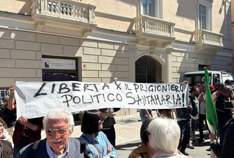 Un gesto di protesta ha fatto irruzione in modo spiazzante ieri mattina in piazza Roma, mentre era in corso di svolgimento la manifestazione per celebrare la Festa del 25 Aprile. Mentre sul palco stava parlando l’assessore Antonella Tartaglia Polcini, è stato srotolato uno striscione recante il testo “Libertà per il prigioniero politico Santamaria”, e contemporaneamente alcuni manifestanti hanno intanto il coro: “Questa amministrazione è solo corruzione”.