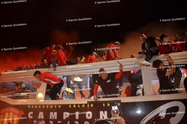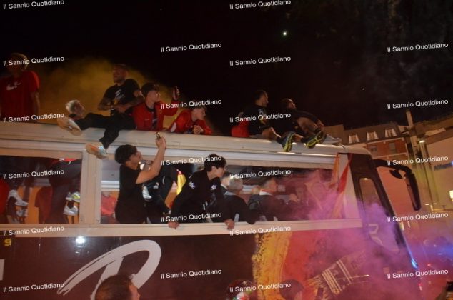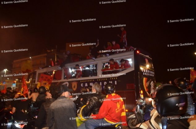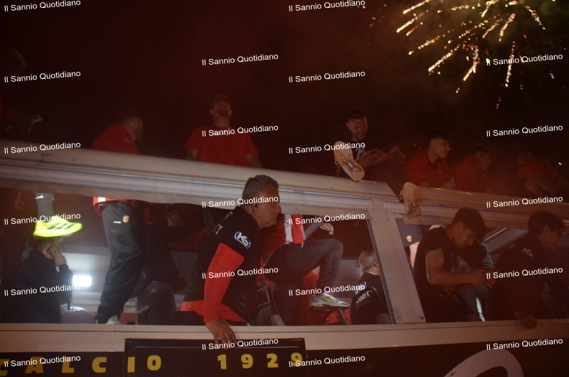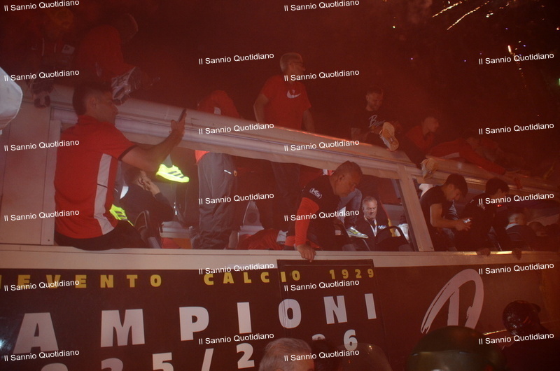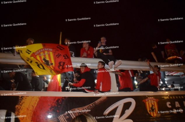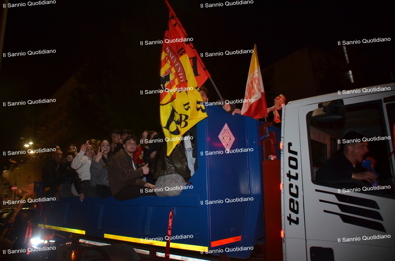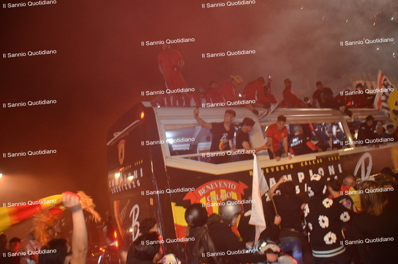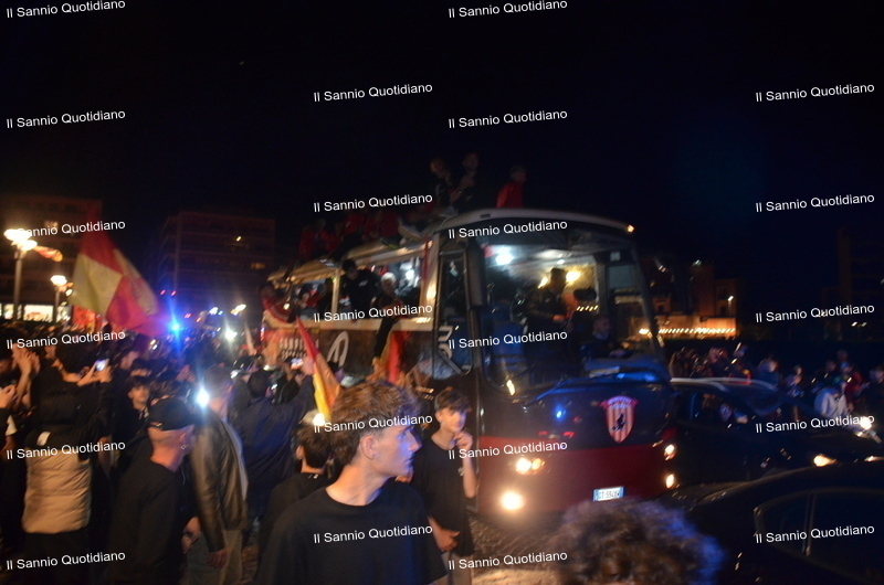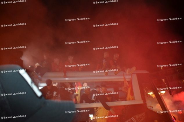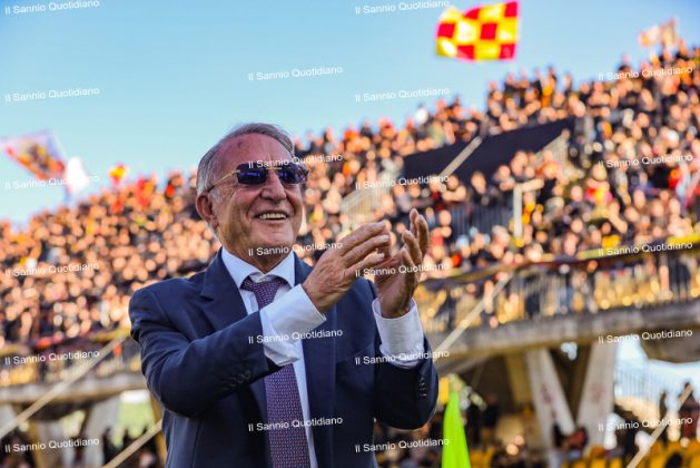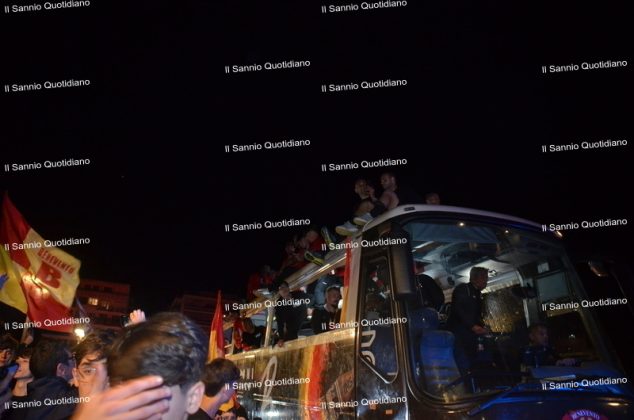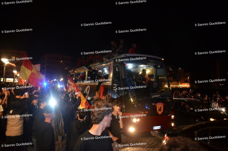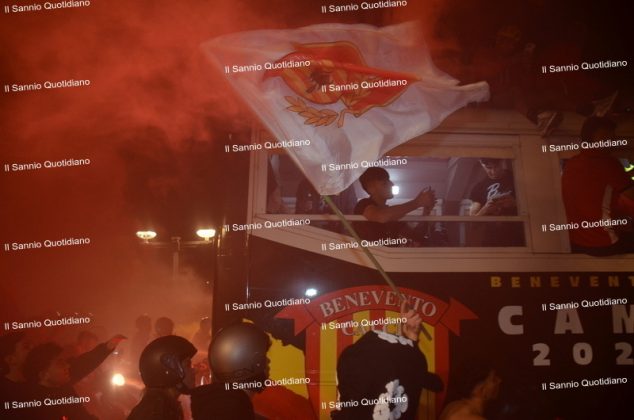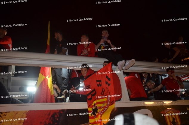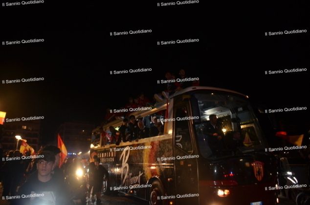 Un giorno atteso a lungo, tra le mille sfumature che hanno attraversato i volti di questi anni. Speranze, lacrime, sensazioni positive e drammi inconsolabili. L’entusiasmo di tutto il “Vigorito” nella sua serata più bella: è festa giallorossa, in uno stadio finalmente gremito e accomunato da una sola passione, quella per la Strega. Una serata lunghissima per i campioni del girone C, aperta dal primo abbraccio tra il presidente Oreste Vigorito e i suoi tifosi, nel giro di campo del patron giallorosso per salutare i sostenitori della Strega, tra gli applausi di tutto lo stadio.