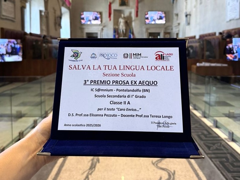 Gli studenti della II classe della Scuola Secondaria di I grado dell’Istituto comprensivo ‘S@minum’ di Pontelandolfo sono stati premiati, ieri mattina, presso la Sala Giulio Cesare del Campidoglio, per il 3° posto nella sezione Prosa del progetto “Salva la tua Lingua Locale” con un lavoro dal titolo “Car’ Ricùcc'”.